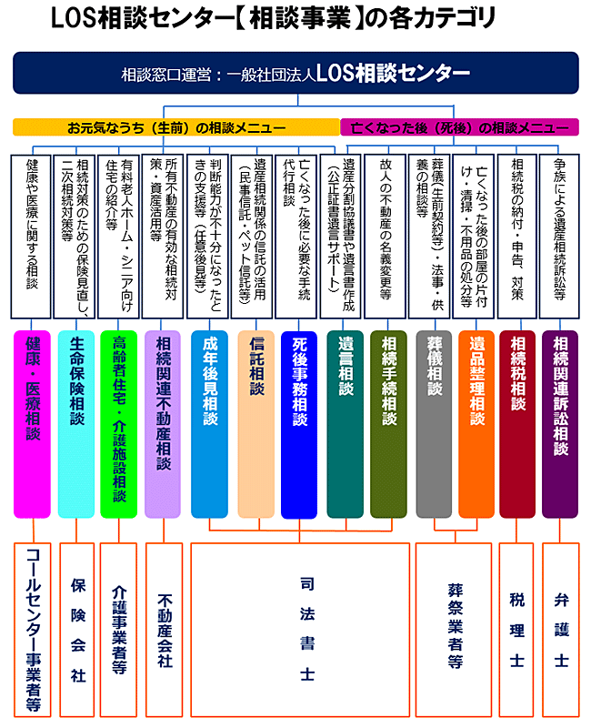 LOS相談センターでは、お客さまのお悩みごと・お困りごとにお応えするため、様々なカテゴリの相談メニューを用意しております。 また、各相談の専門家(Specialist)とのネットワークを構築し、お客さまによりスムーズかつ安心してご相談いただける体制を整えております。